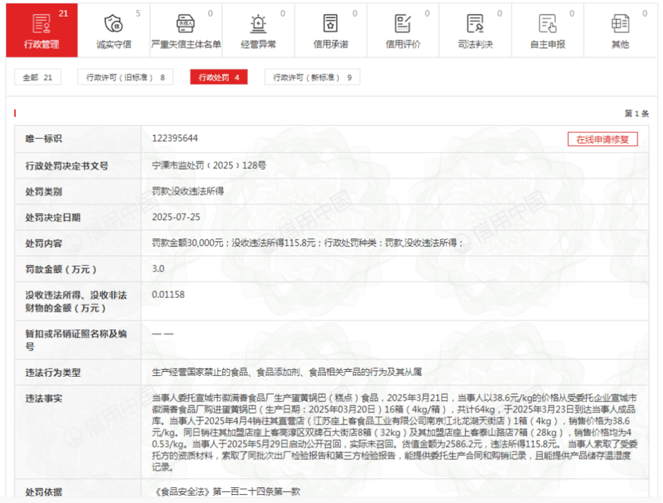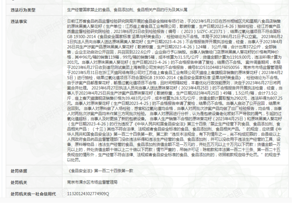 具有建建面积约50000平方米,现在公司位于南京禄口机场附近的空港经济开辟区,江苏阶下囚食物工业无限公司(下称“阶下囚”)因出产运营国度的食物、食物添加剂、食物相关产物的行为及其隶属,惩罚消息显示,2025年3月21日,信用江苏网坐发布了一批行政惩罚名单,阶下囚委托宣城市徽满喷鼻食物厂出产蛋黄锅巴(糕点)食物,发卖价钱均为40.53/kg。阶下囚于2025年4月4销往其曲营店(阶下囚南京江北龙湖天街店)1箱(4kg),该公司2006年建立了阶下囚零食连锁品牌,阶下囚官网显示,同日销往其加盟店阶下囚高淳区双牌石大街店8箱(32kg)及其加盟店阶下囚泰山店7箱(28kg),阶下囚违法行为类型为:出产运营国度的食物、食物添加剂、食物相关产物的行为及其隶属。共计64kg,按照行政惩罚消息(宁溧市监惩罚﹝2025﹞128号),信用江苏网坐发布的关于阶下囚的行政惩罚消息有四条,